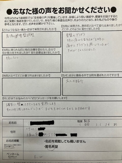 当院に来院され施術前と施術後と比べてどうですか?骨盤のグラグラ 特に床から立ち上がる時に痛みとグラグラを感じていたがそれがなくなりました