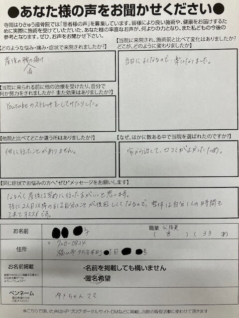 同じ症状でお悩みの方へメッセージをお願いします。なるべく産後は早めに行ったほうがいいと思います